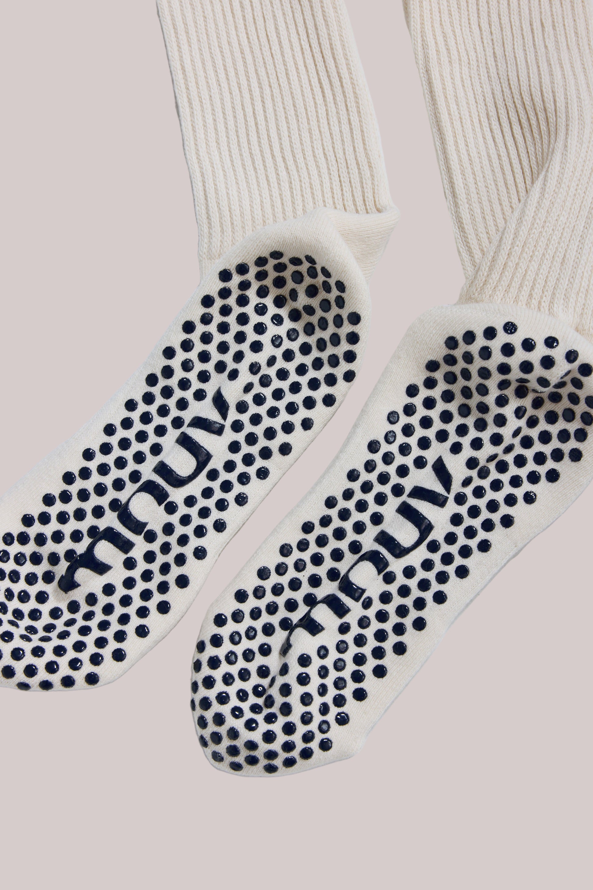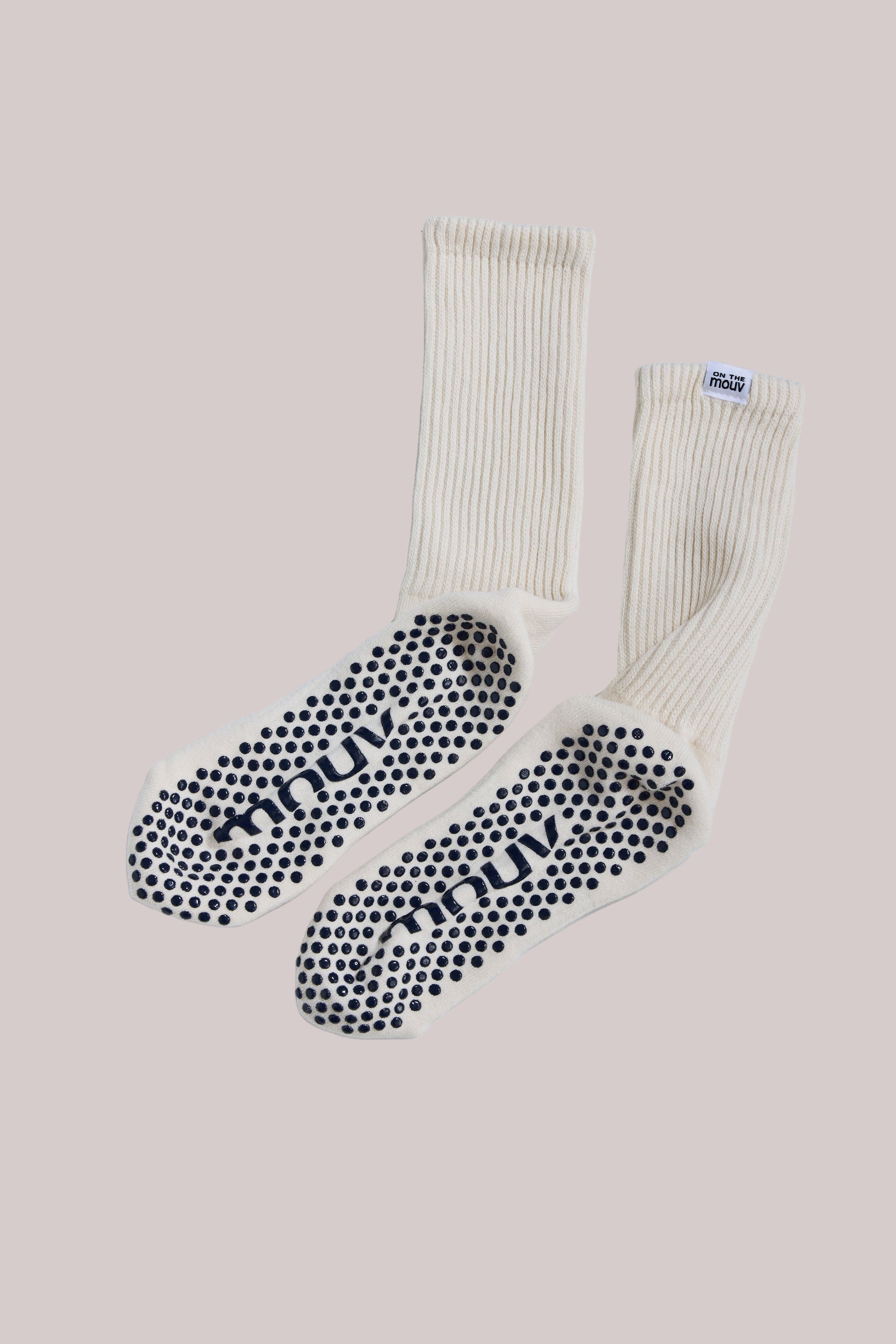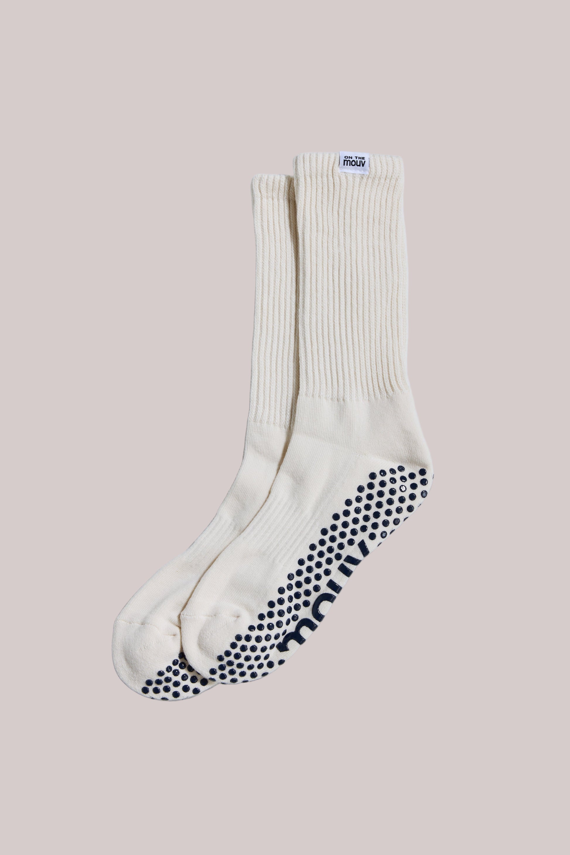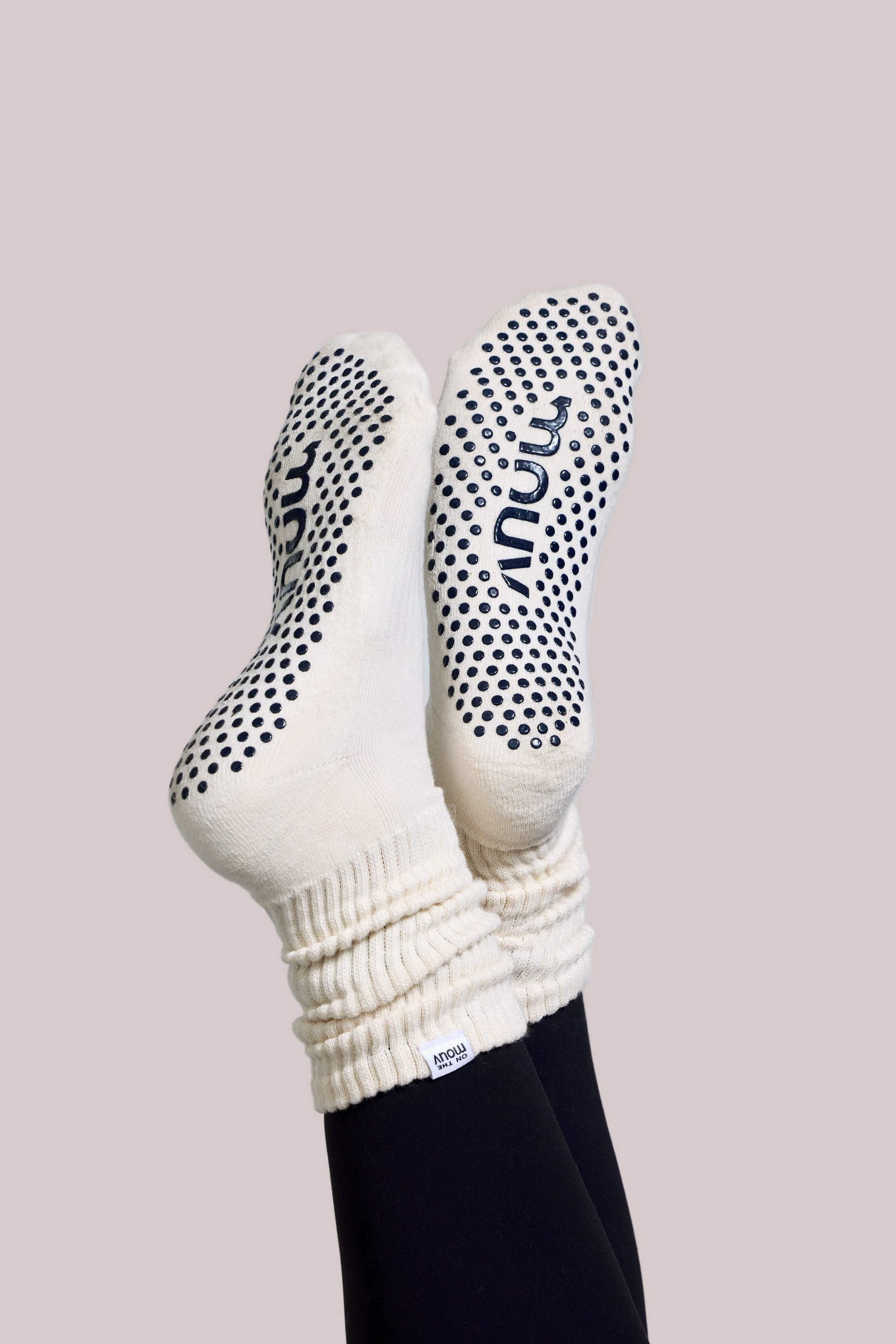 Elevate your flow with our signature Slouch Grip Socks in cream.